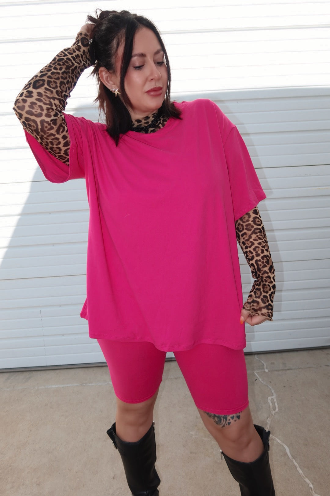 Oversized short-sleeve top for a casual and trendy vibe -High-waisted biker shorts with a snug and secure fit -Soft, stretchy fabric for ultimate comfort -Perfect for lounging, workouts, or casual outings top and biker shorts set, loose fit two-piece set, oversized top and shorts set, comfy lounge set, casual two-piece outfit, high-waisted biker shorts set, women's relaxed fit set