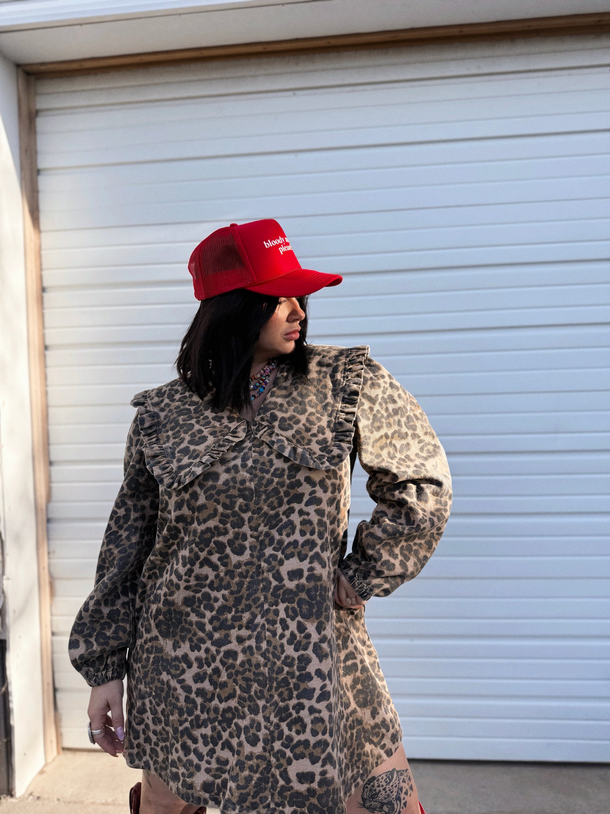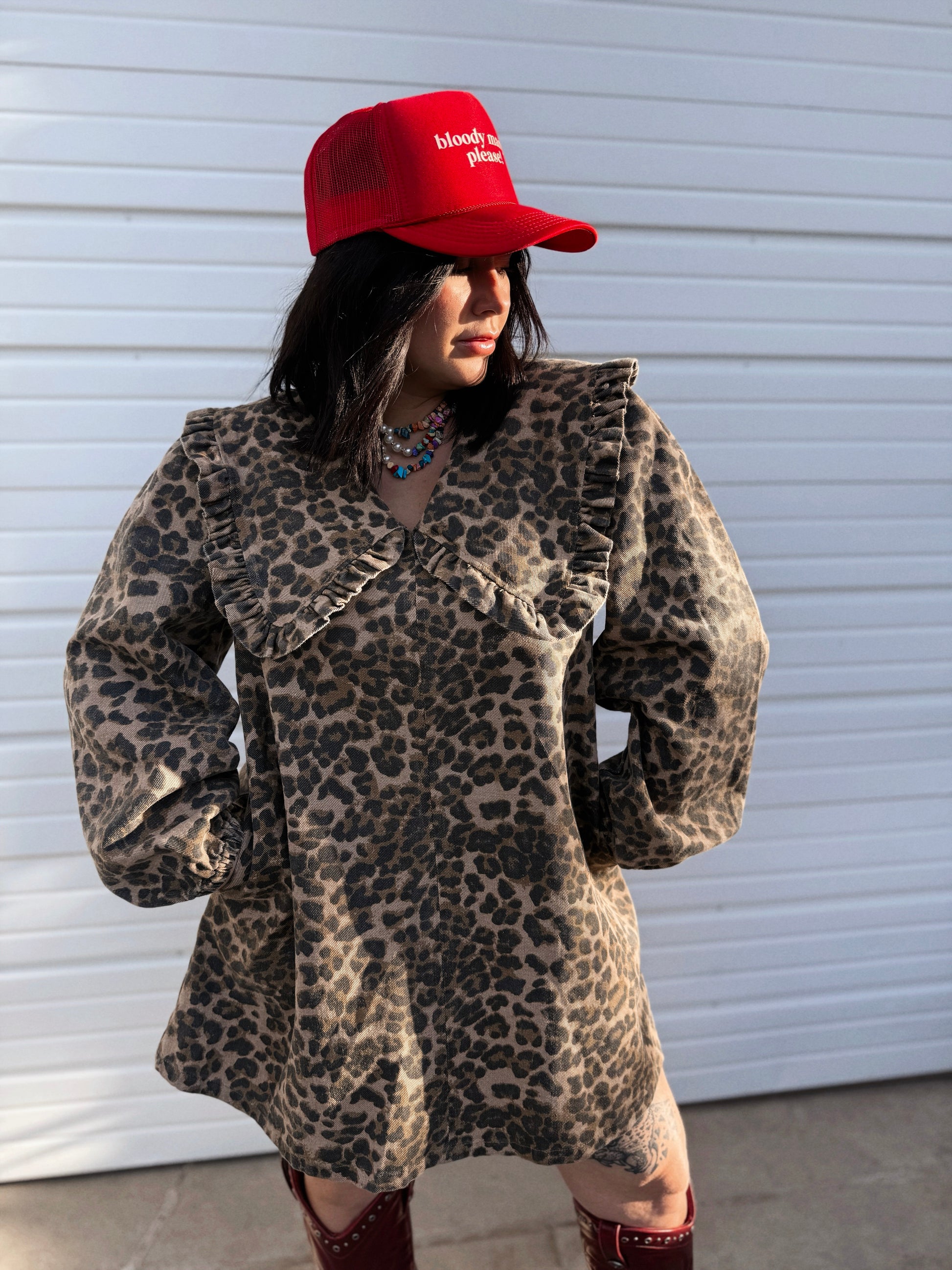 This short, spunky dress merges funky denim vibes with chic leopard print. Featuring puff sleeves and a smart collar, it balances playful edge with sophisticated style for a standout look. Oh, and she has pockets